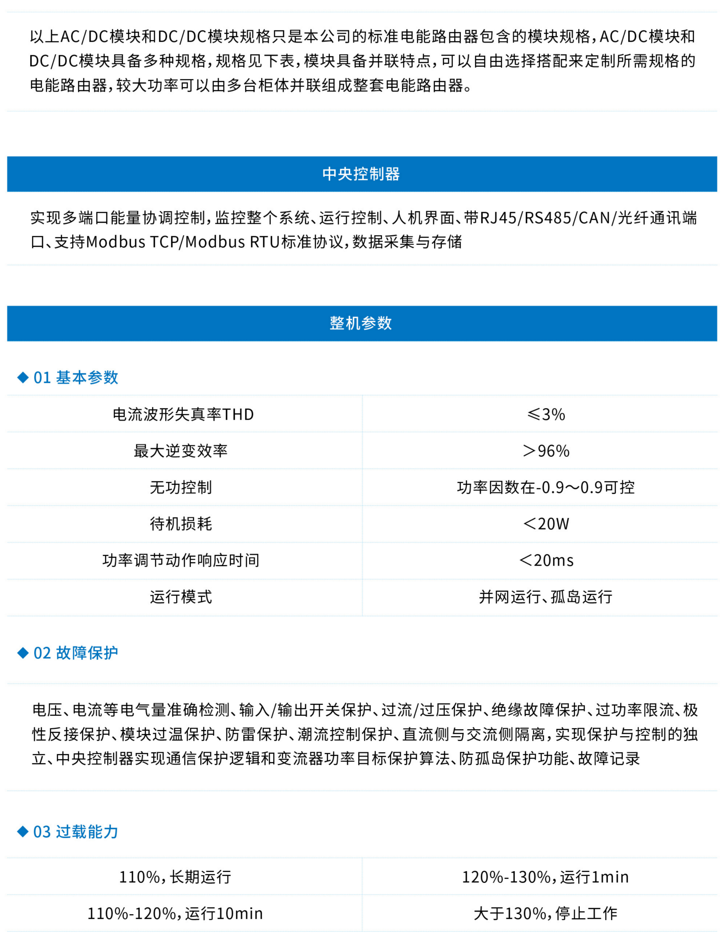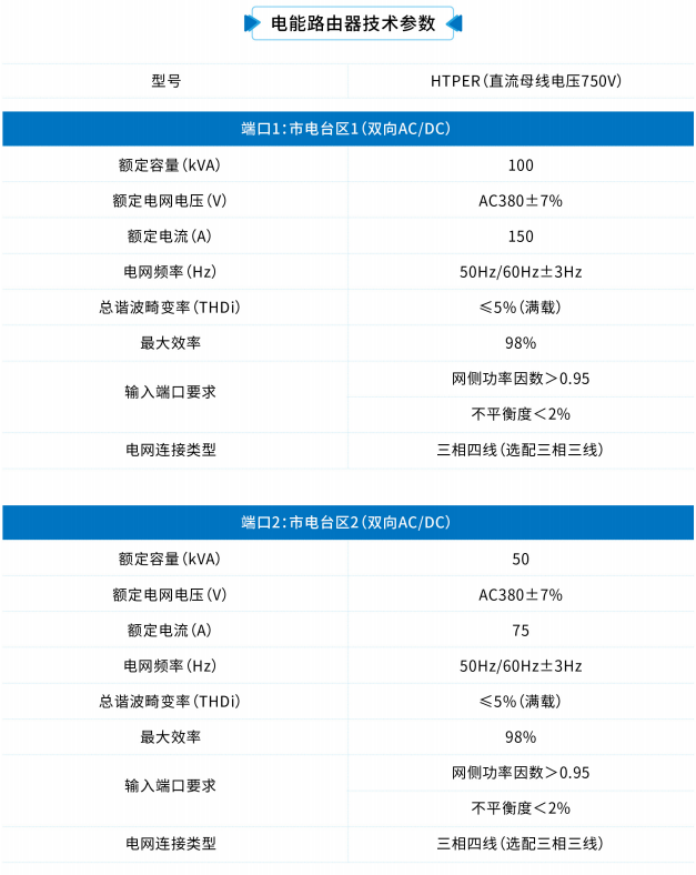 端口數(shù)量和大小可根據(jù)用戶需求定制,較大功率的電能路由器采用多模塊并聯(lián)設(shè)計,由多臺柜體組成整套電能路由器,功率范圍擴大到400kW,單端口最大功率可達500kW。