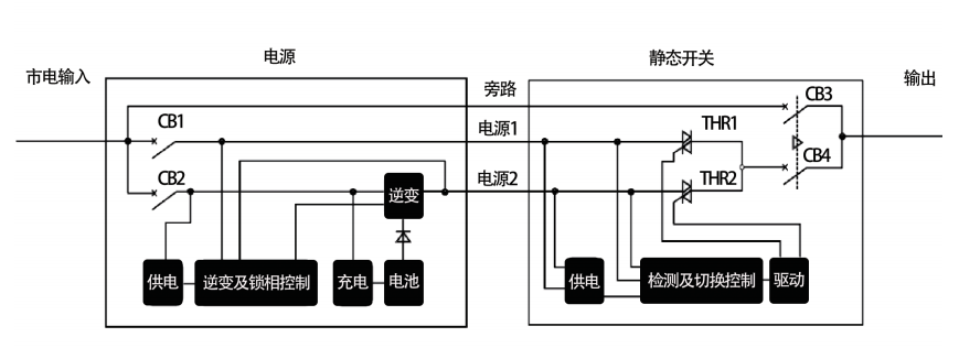 為了方便維護(hù),系統(tǒng)內(nèi)還設(shè)置有旁路開(kāi)關(guān),在檢修或系統(tǒng)故障時(shí)可以繼續(xù)向負(fù)載供電。